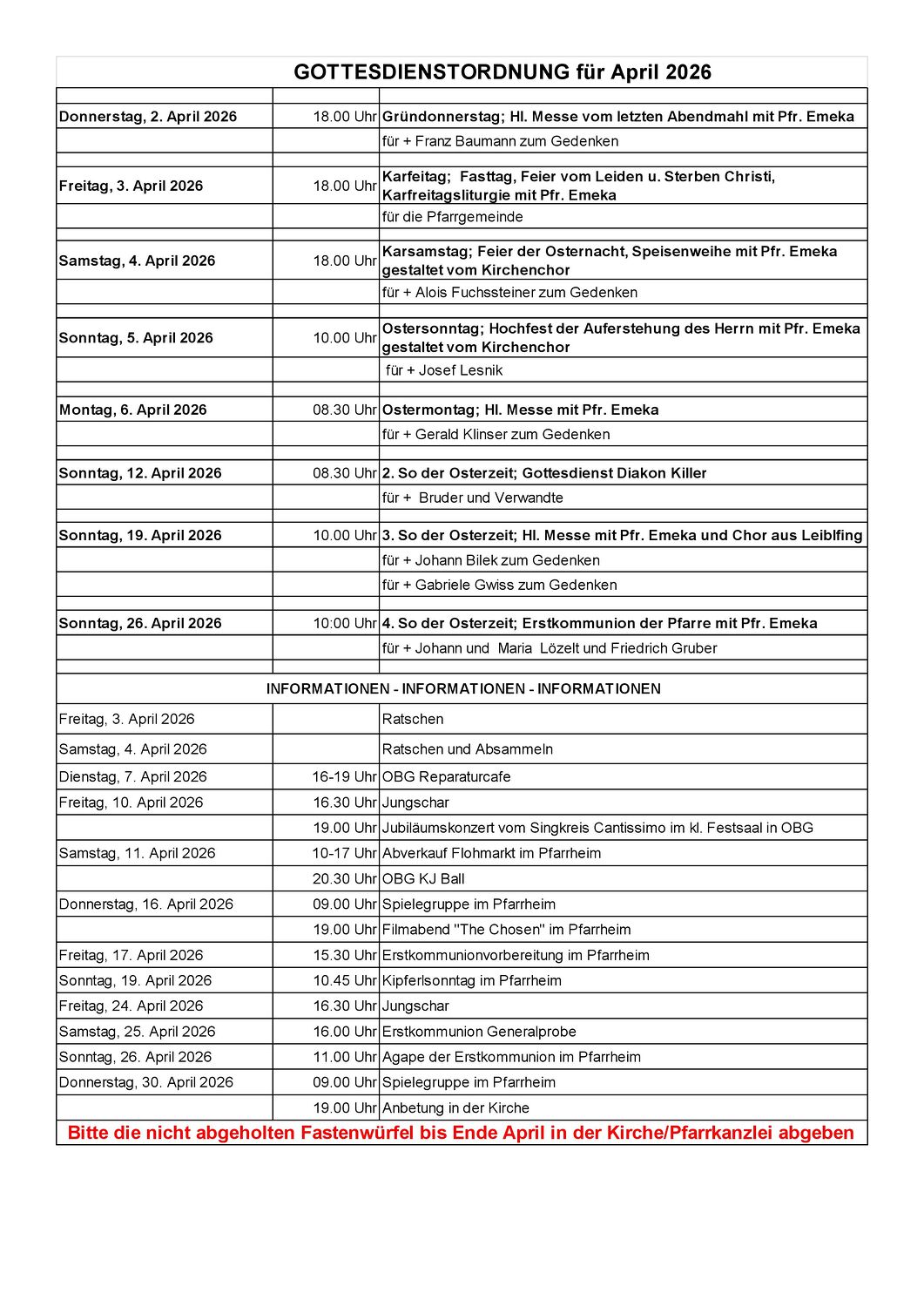 Gottesdienstordnung April