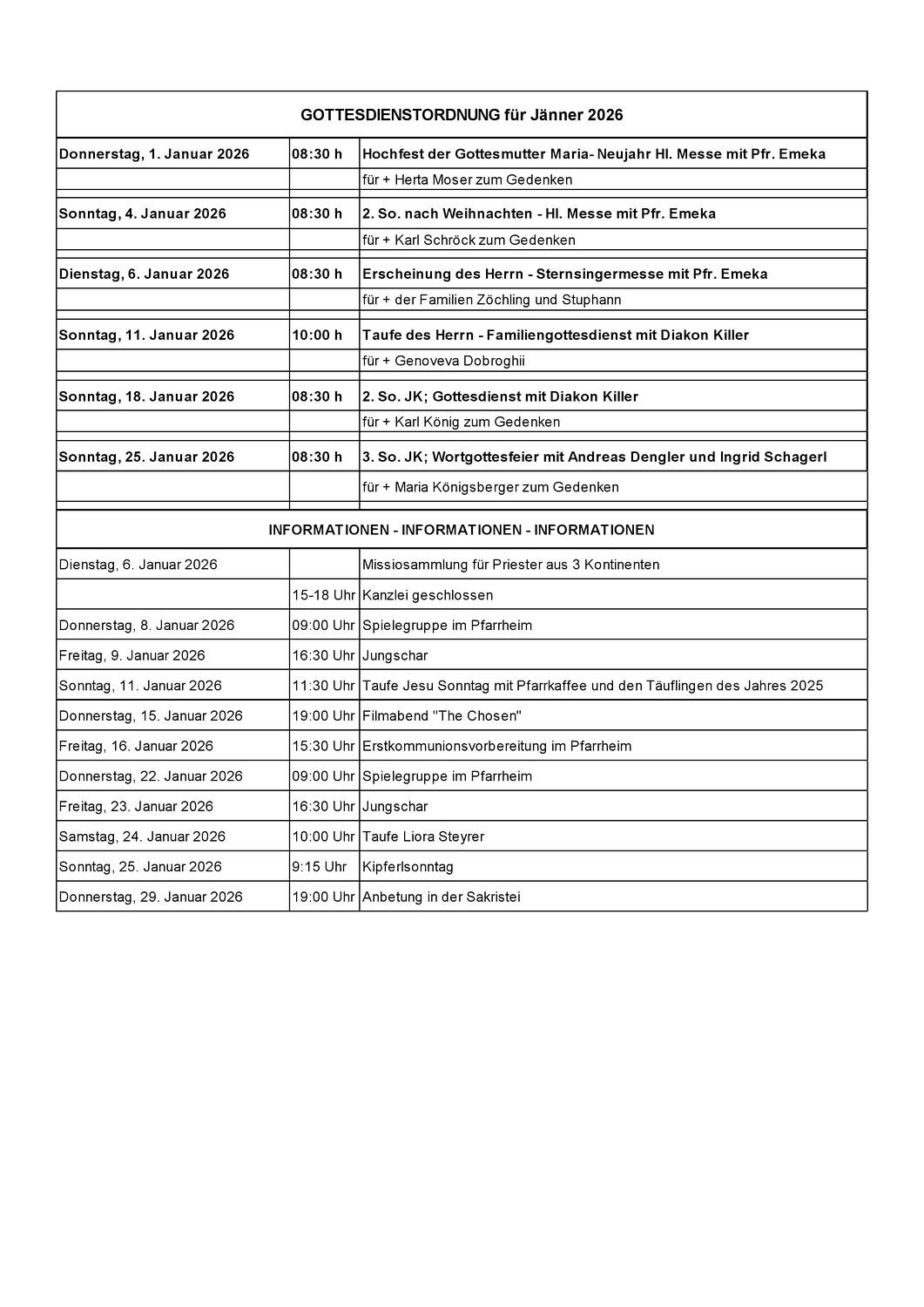 Gottesdienstordnung Jänner 2026